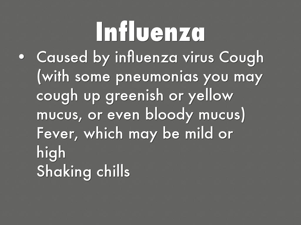 Caused by influenza virus Cough (with some pneumonias you may cough up greenish or yellow mucus, or even bloody mucus) Fever, which may be mild or high Shaking chills