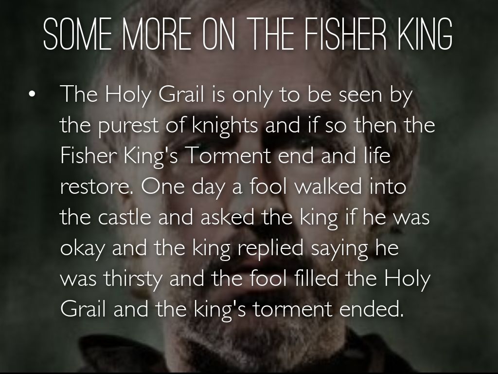 The Holy Grail is only to be seen by the purest of knights and if so then the Fisher King's Torment end and life restore. One day a fool walked into the castle and asked the king if he was okay and the king replied saying he was thirsty and the fool filled the Holy Grail and the king's torment ended.