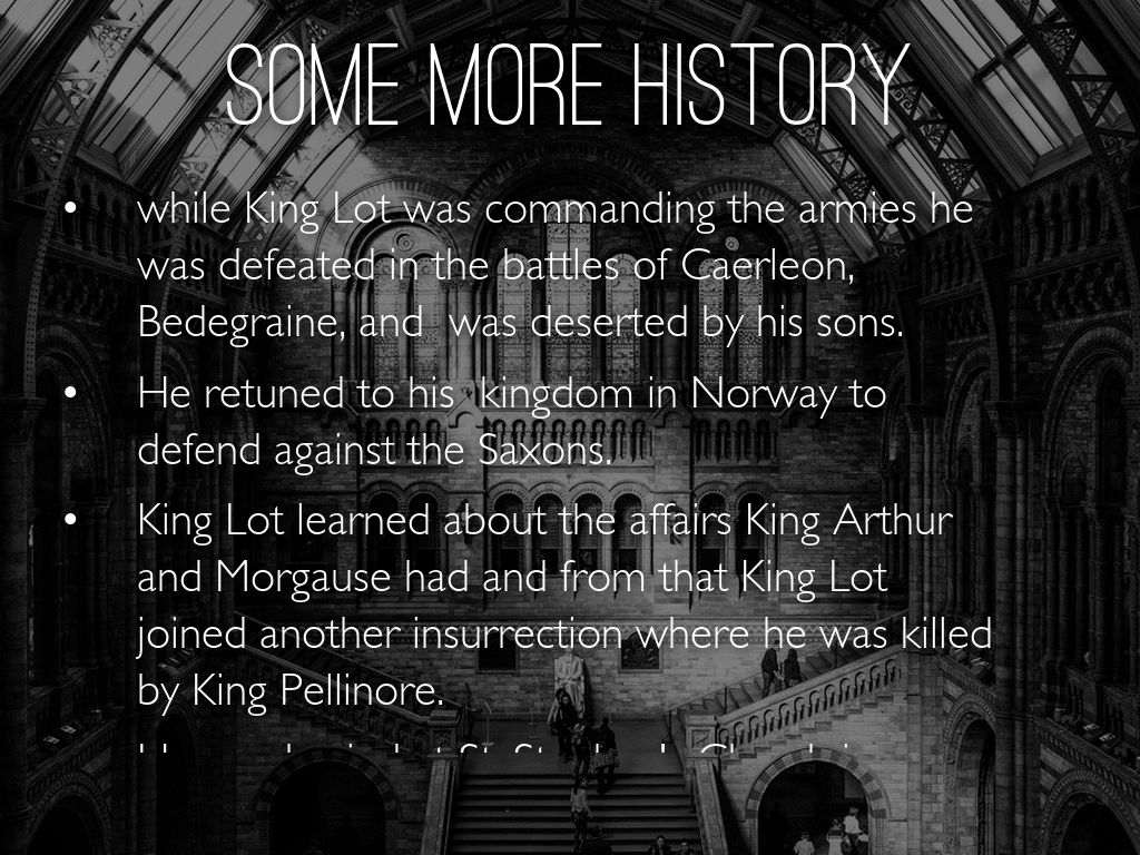 King Lot learned about the affairs King Arthur and Morgause had and from that King Lot joined another insurrection where he was killed by King Pellinore.