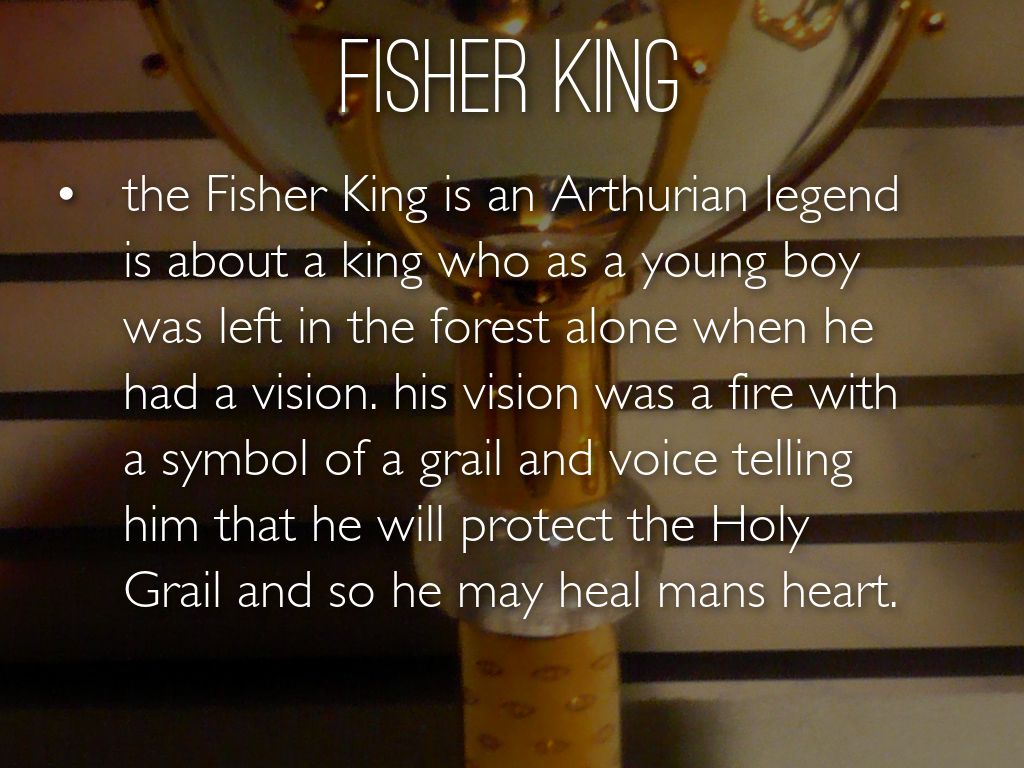 the Fisher King is an Arthurian legend is about a king who as a young boy was left in the forest alone when he had a vision. his vision was a fire with a symbol of a grail and voice telling him that he will protect the Holy Grail and so he may heal mans heart.