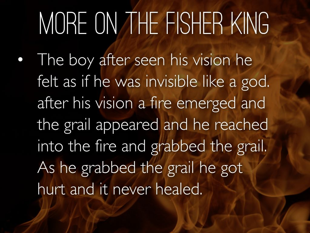 The boy after seen his vision he felt as if he was invisible like a god. after his vision a fire emerged and the grail appeared and he reached into the fire and grabbed the grail. As he grabbed the grail he got hurt and it never healed.
