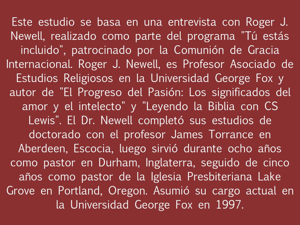 Este estudio se basa en una entrevista con Roger J. Newell, realizado como parte del programa "Tú estás incluido", patrocinado por la Comunión de Gracia Internacional. Roger J. Newell, es Profesor Asociado de Estudios Religiosos en la Universidad George Fox y autor de "El Progreso del Pasión: Los significados del amor y el intelecto" y "Leyendo la Biblia con CS Lewis". El Dr. Newell completó sus estudios de doctorado con el profesor James Torrance en Aberdeen, Escocia, luego sirvió durante ocho años como pastor en Durham, Inglaterra, seguido de cinco años como pastor de la Iglesia Presbiteriana Lake Grove en Portland, Oregon. Asumió su cargo actual en la Universidad George Fox en 1997.