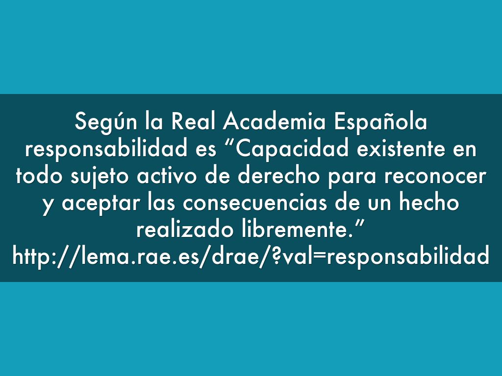 Según la Real Academia Española responsabilidad es “Capacidad existente en todo sujeto activo de derecho para reconocer y aceptar las consecuencias de un hecho realizado libremente.” http://lema.rae.es/drae/?val=responsabilidad