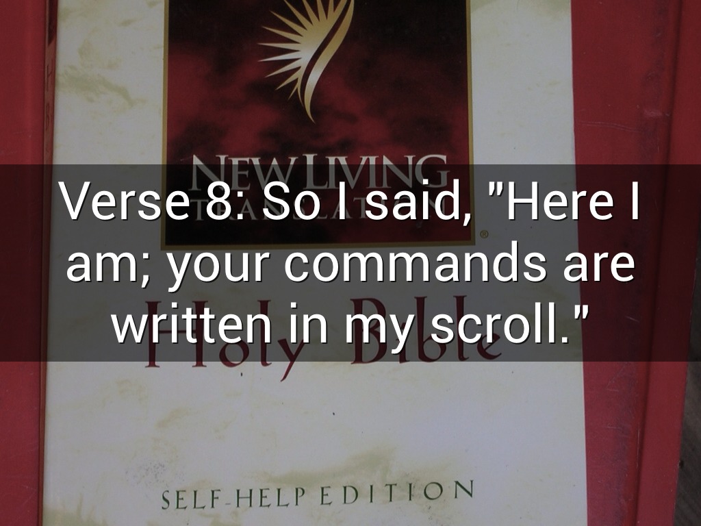 Verse 8: So I said, "Here I am; your commands are written in my scroll."