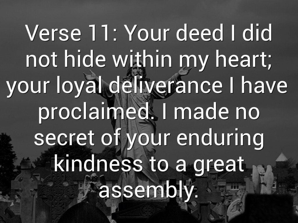Verse 11: Your deed I did not hide within my heart; your loyal deliverance I have proclaimed. I made no secret of your enduring kindness to a great assembly.