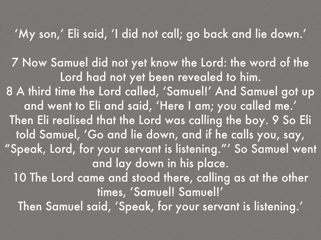 Then Eli realised that the Lord was calling the boy. 9 So Eli told Samuel, ‘Go and lie down, and if he calls you, say, “Speak, Lord, for your servant is listening.”’ So Samuel went and lay down in his place.