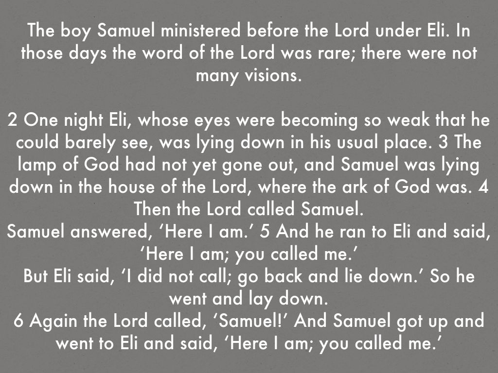 Samuel answered, ‘Here I am.’ 5 And he ran to Eli and said, ‘Here I am; you called me.’