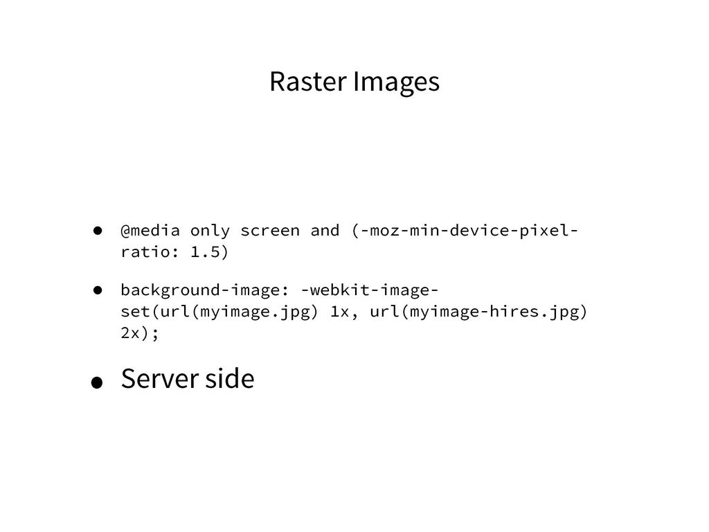 HiDPI displays are coming to the desktop, and the majority of the web is not ready. In this session we'll look at the importance of being retina ready and we'll compare different methods for leveraging HiDPI and DPI agnostic assets.