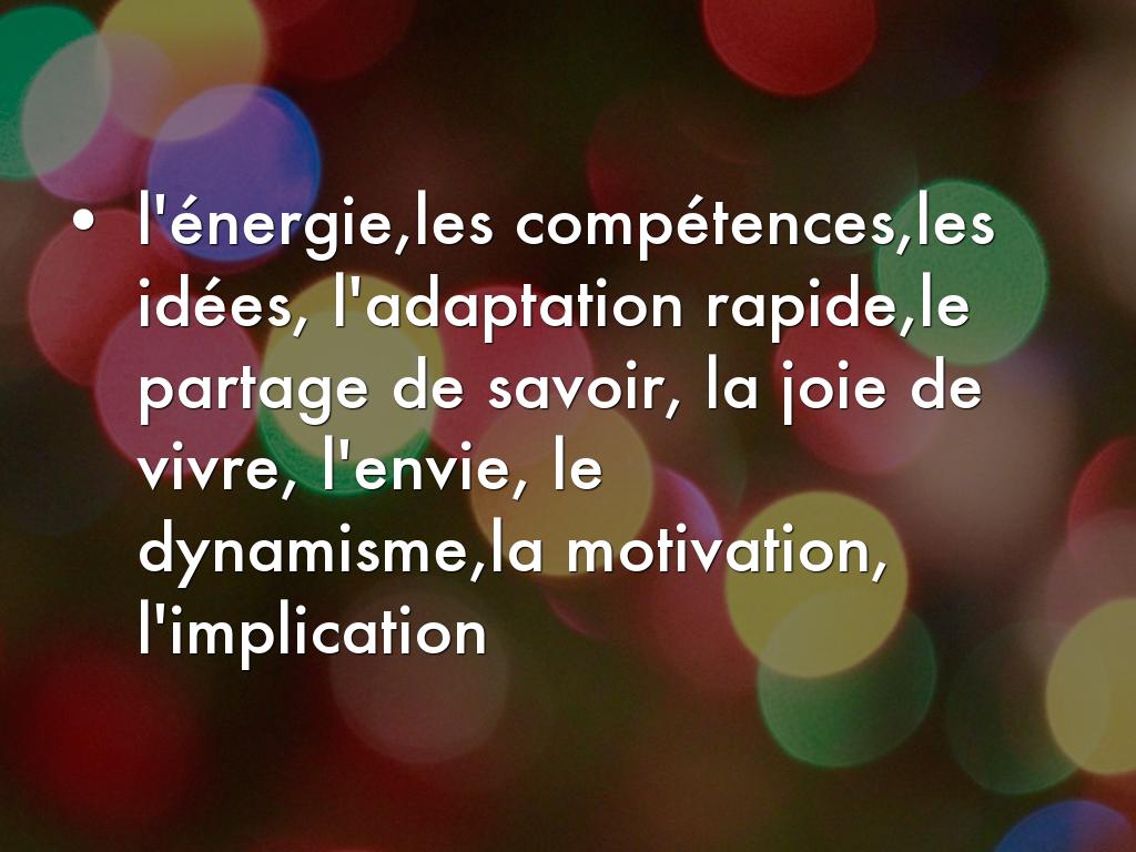 l'énergie,les compétences,les idées, l'adaptation rapide,le partage de savoir, la joie de vivre, l'envie, le dynamisme,la motivation, l'implication