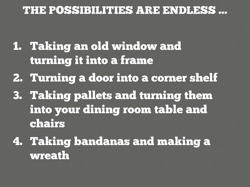 • Taking pallets and turning them into your dining room table and chairs
