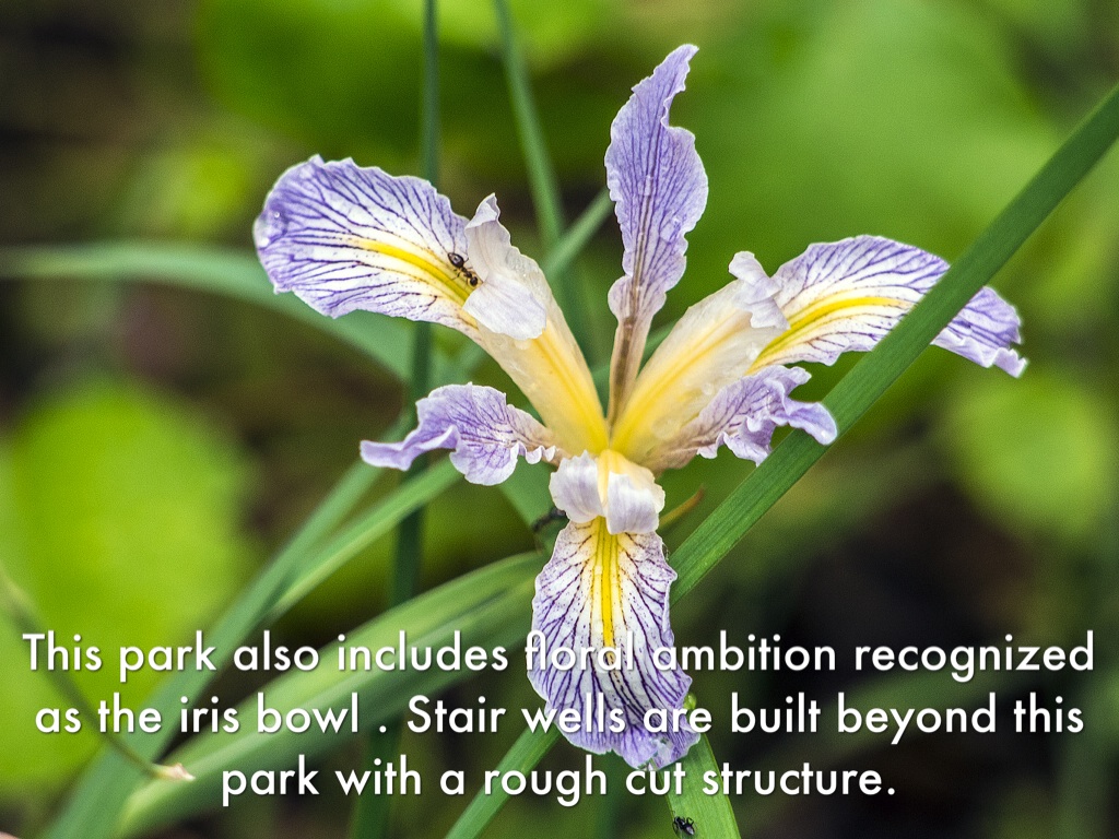 This park also includes floral ambition recognized as the iris bowl . Stair wells are built beyond this park with a rough cut structure.