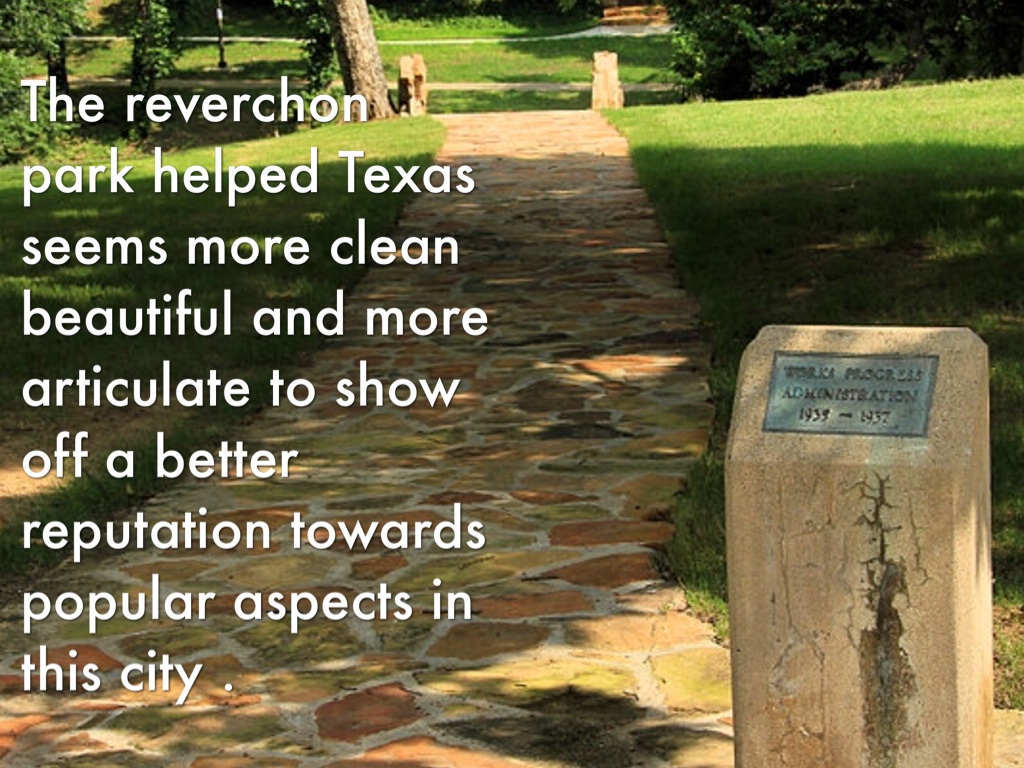 The reverchon park helped Texas seems more clean beautiful and more articulate to show off a better reputation towards popular aspects in this city .