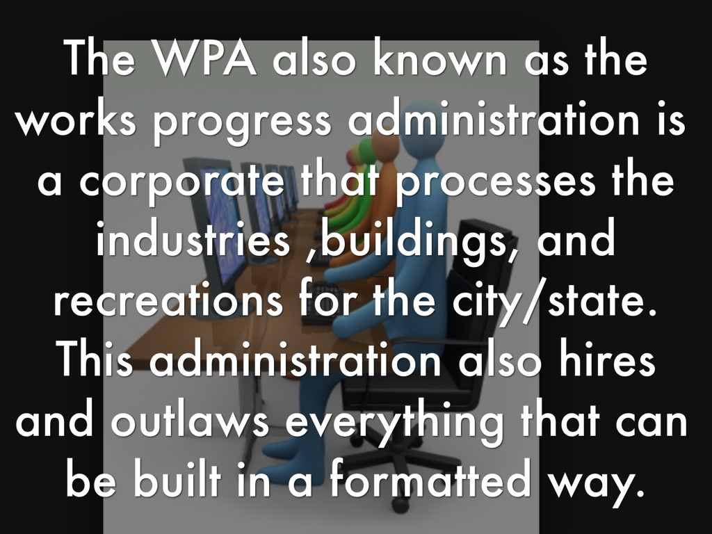 The WPA also known as the works progress administration is a corporate that processes the industries ,buildings, and recreations for the city/state. This administration also hires and outlaws everything that can be built in a formatted way.