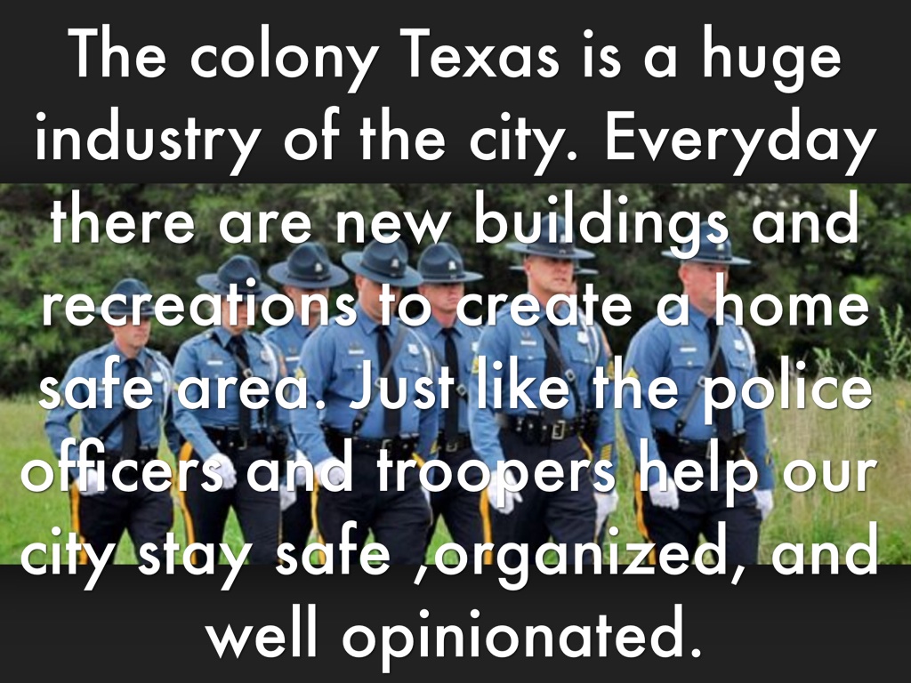 The colony Texas is a huge industry of the city. Everyday there are new buildings and recreations to create a home safe area. Just like the police officers and troopers help our city stay safe ,organized, and well opinionated.