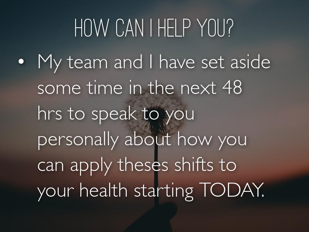 My team and I have set aside some time in the next 48 hrs to speak to you personally about how you can apply theses shifts to your health starting TODAY.