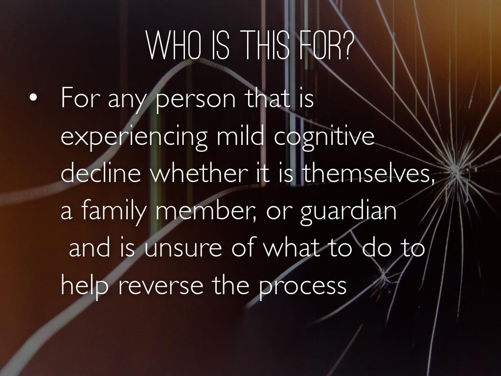 For any person that is experiencing mild cognitive decline whether it is themselves, a family member, or guardian and is unsure of what to do to help reverse the process