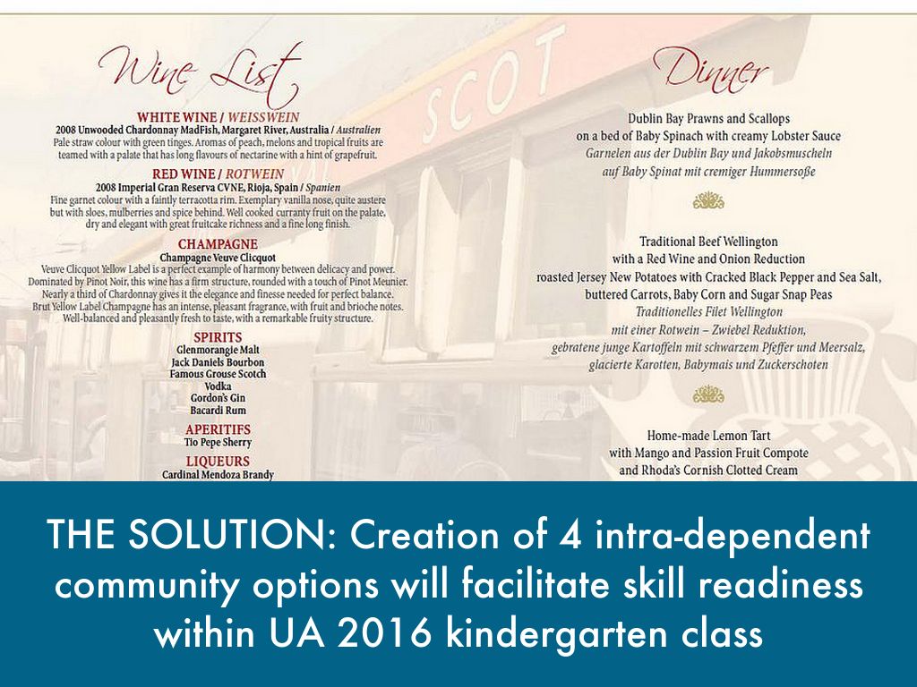 THE SOLUTION: Creation of 4 intra-dependent community options will facilitate skill readiness within UA 2016 kindergarten class