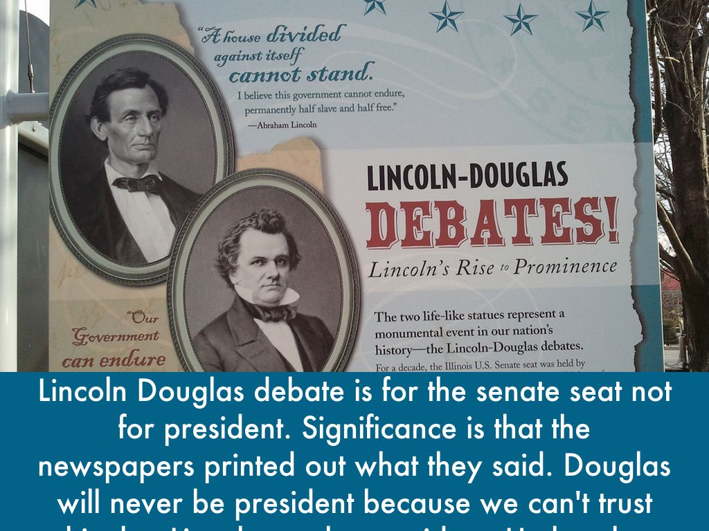 Lincoln Douglas debate is for the senate seat not for president. Significance is that the newspapers printed out what they said. Douglas will never be president because we can't trust him but Lincoln can be president. He lost the senate race but won the president