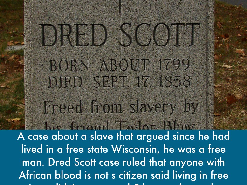 A case about a slave that argued since he had lived in a free state Wisconsin, he was a free man. Dred Scott case ruled that anyone with African blood is not s citizen said living in free territory didn't matter and 5th amendment slaves were property, Calhoun was arguing south liked the dred Scott decision
