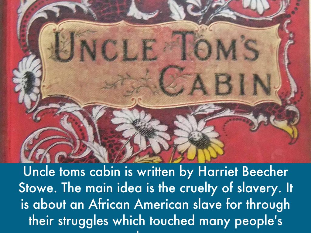 Uncle toms cabin is written by Harriet Beecher Stowe. The main idea is the cruelty of slavery. It is about an African American slave for through their struggles which touched many people's hearts.