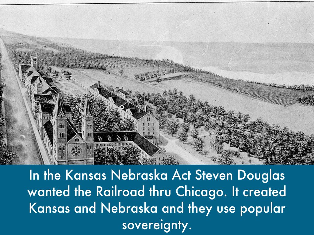 In the Kansas Nebraska Act Steven Douglas wanted the Railroad thru Chicago. It created Kansas and Nebraska and they use popular sovereignty.