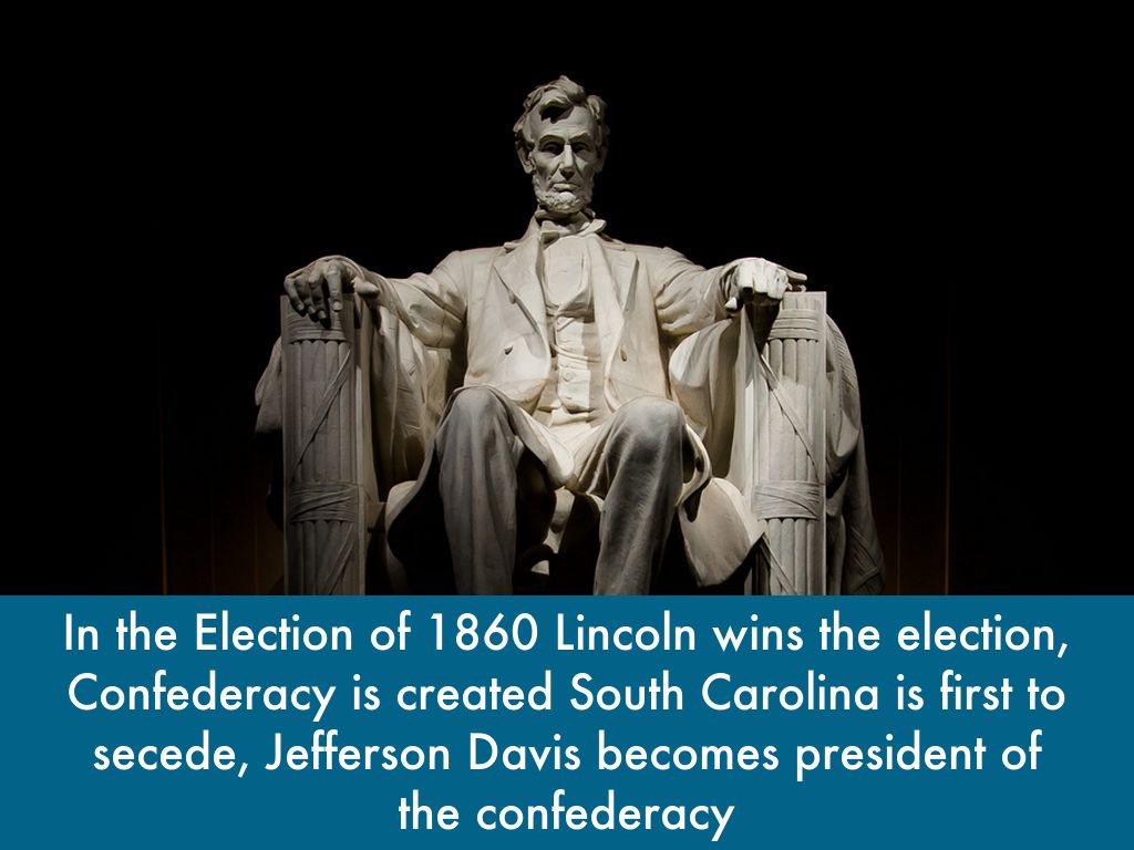 In the Election of 1860 Lincoln wins the election, Confederacy is created South Carolina is first to secede, Jefferson Davis becomes president of the confederacy
