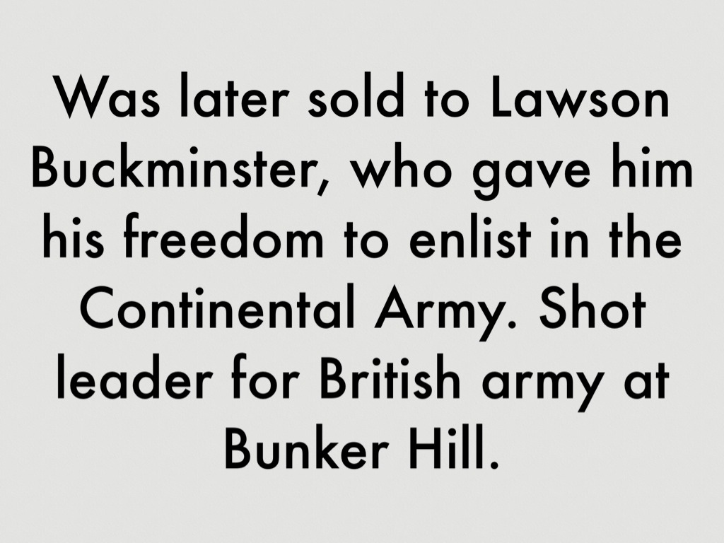 Was later sold to Lawson Buckminster, who gave him his freedom to enlist in the Continental Army. Shot leader for British army at Bunker Hill.