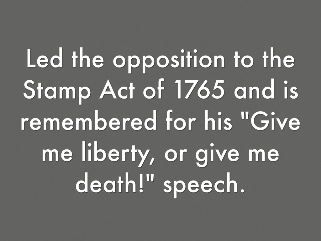 Led the opposition to the Stamp Act of 1765 and is remembered for his "Give me liberty, or give me death!" speech.