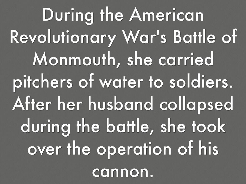 During the American Revolutionary War's Battle of Monmouth, she carried pitchers of water to soldiers. After her husband collapsed during the battle, she took over the operation of his cannon.