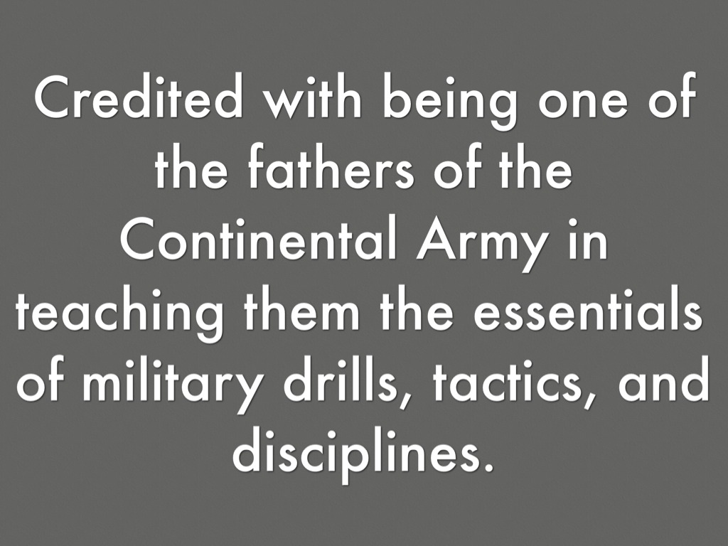 Credited with being one of the fathers of the Continental Army in teaching them the essentials of military drills, tactics, and disciplines.