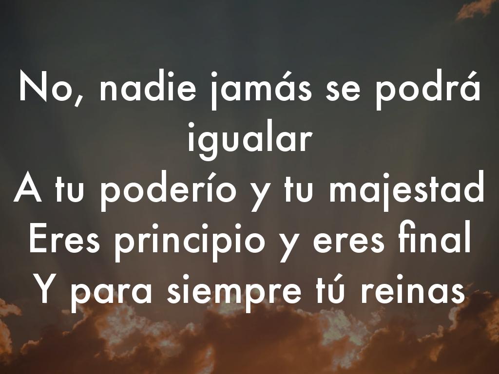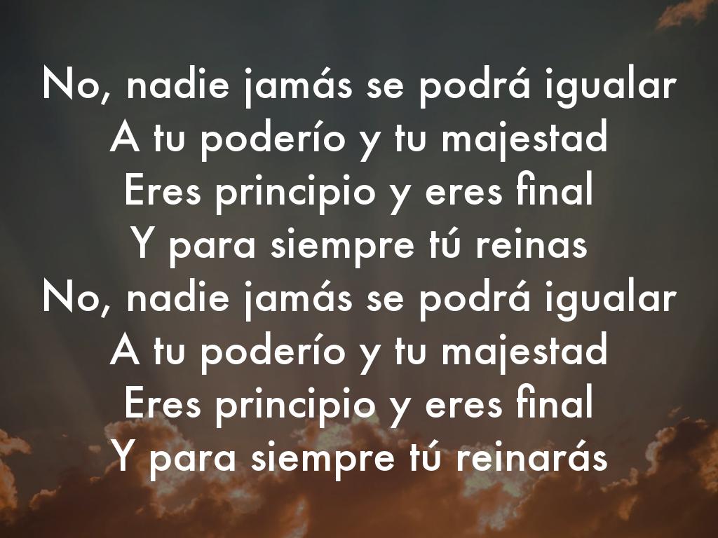 No, nadie jamás se podrá igualar A tu poderío y tu majestad Eres principio y eres final Y para siempre tú reinas No, nadie jamás se podrá igualar A tu poderío y tu majestad Eres principio y eres final Y para siempre tú reinarás