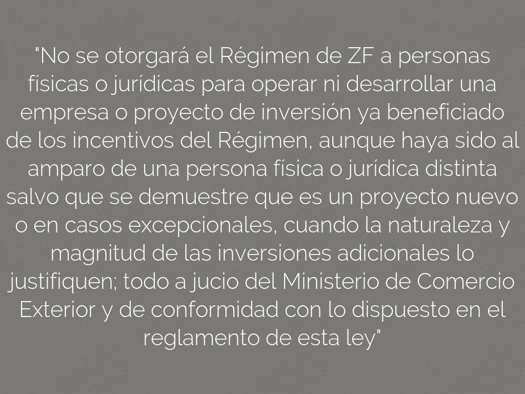 "No se otorgará el Régimen de ZF a personas físicas o jurídicas para operar ni desarrollar una empresa o proyecto de inversión ya beneficiado de los incentivos del Régimen, aunque haya sido al amparo de una persona física o jurídica distinta salvo que se demuestre que es un proyecto nuevo o en casos excepcionales, cuando la naturaleza y magnitud de las inversiones adicionales lo justifiquen; todo a jucio del Ministerio de Comercio Exterior y de conformidad con lo dispuesto en el reglamento de esta ley"