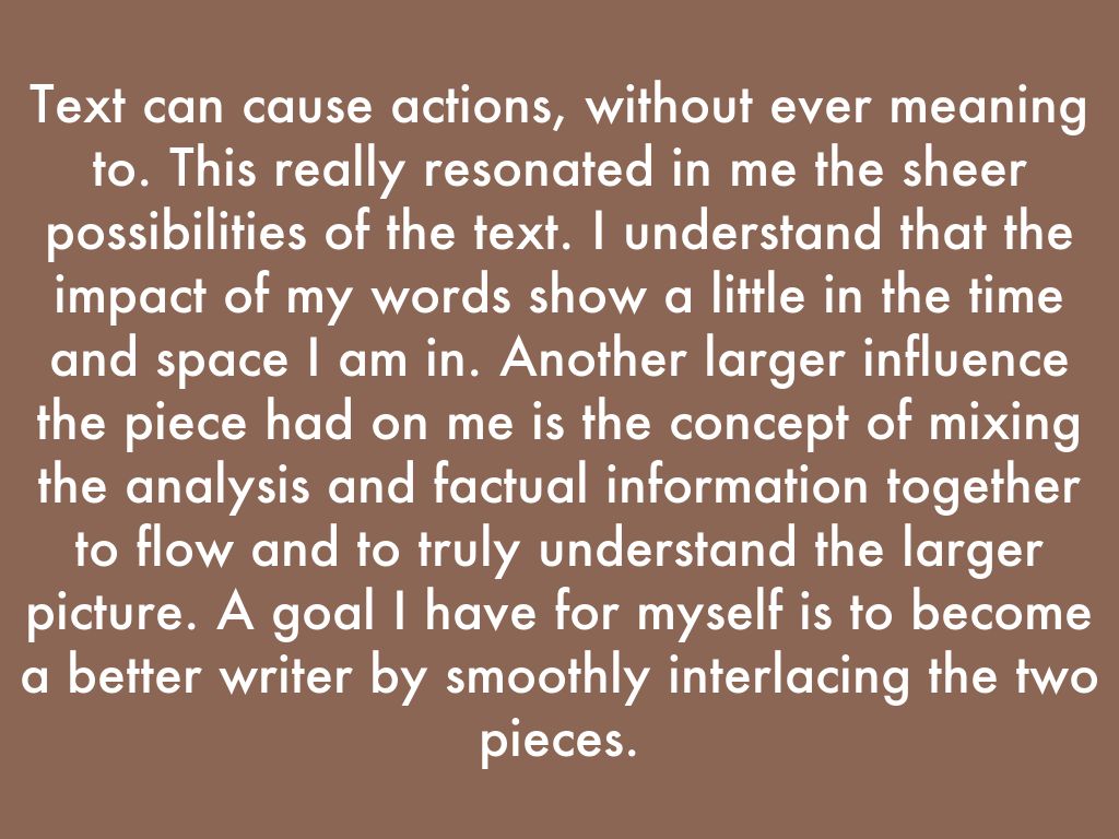 Text can cause actions, without ever meaning to. This really resonated in me the sheer possibilities of the text. I understand that the impact of my words show a little in the time and space I am in. Another larger influence the piece had on me is the concept of mixing the analysis and factual information together to flow and to truly understand the larger picture. A goal I have for myself is to become a better writer by smoothly interlacing the two pieces.