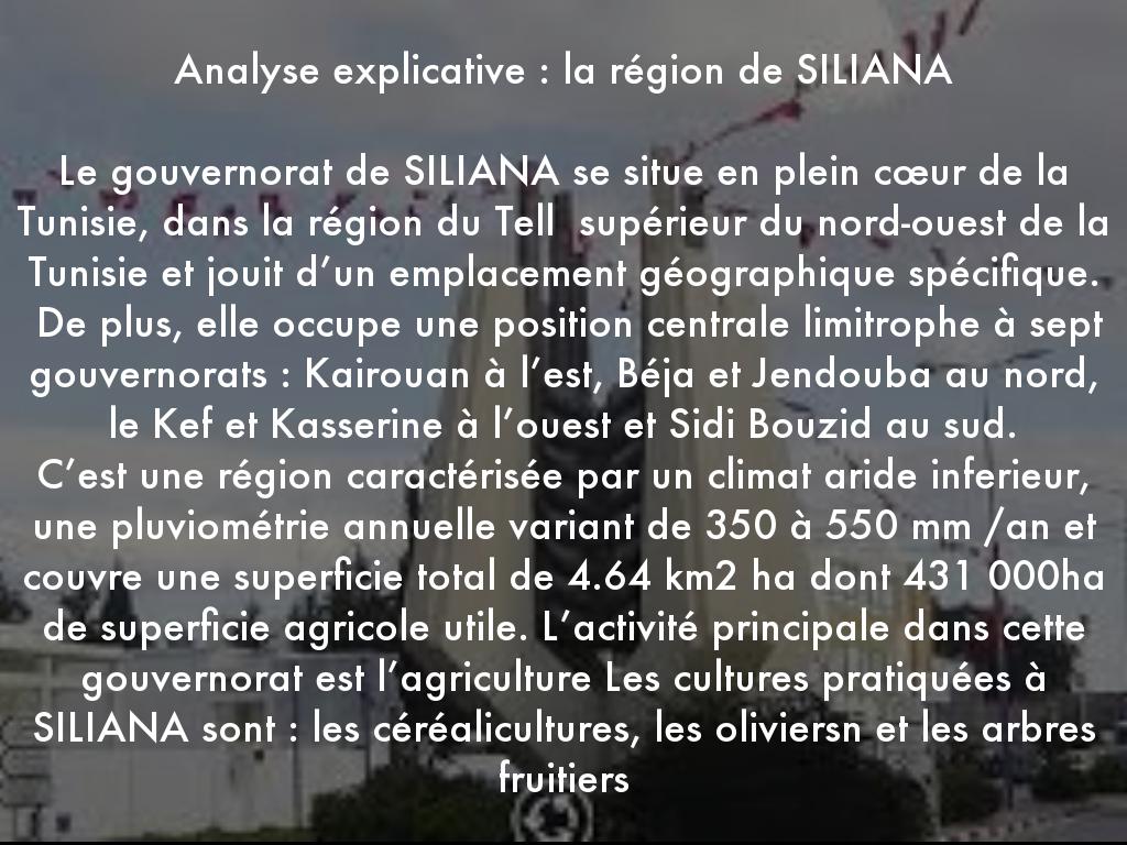 C’est une région caractérisée par un climat aride inferieur, une pluviométrie annuelle variant de 350 à 550 mm /an et couvre une superficie total de 4.64 km2 ha dont 431 000ha de superficie agricole utile. L’activité principale dans cette gouvernorat est l’agriculture Les cultures pratiquées à SILIANA sont : les céréalicultures, les oliviersn et les arbres fruitiers