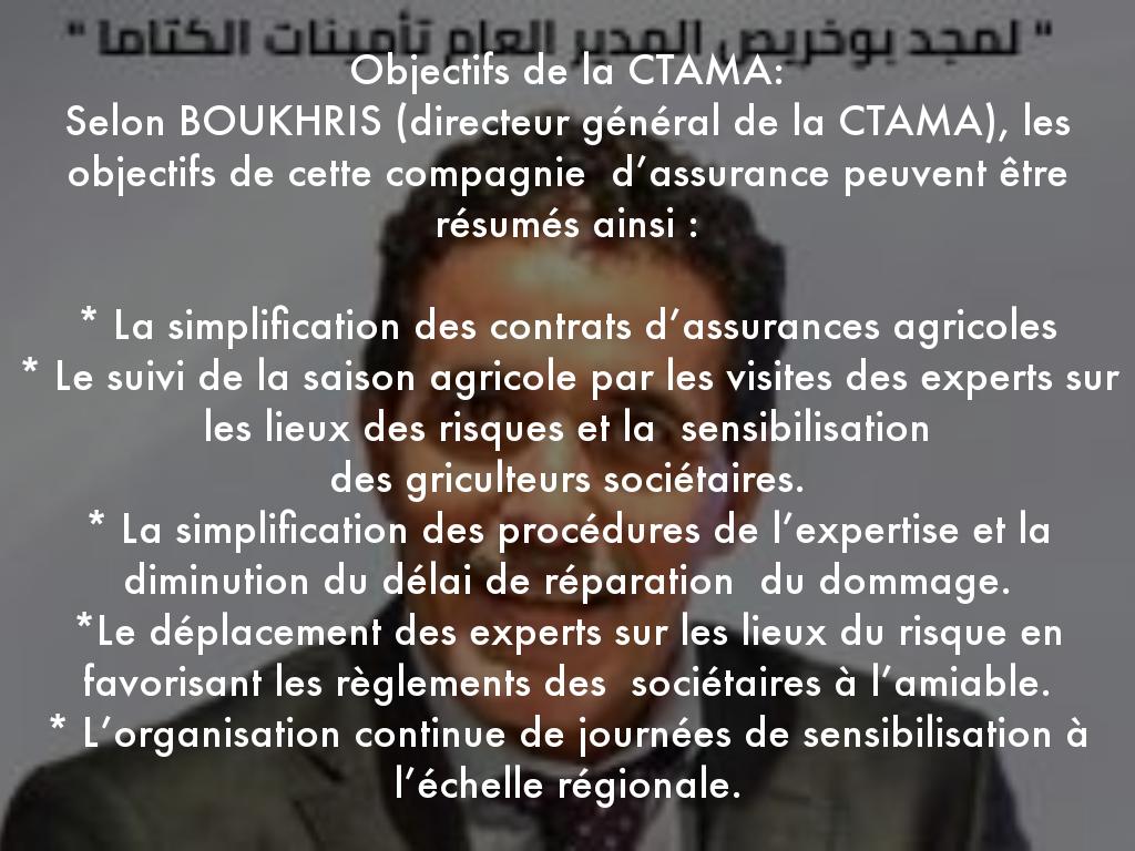 Selon BOUKHRIS (directeur général de la CTAMA), les objectifs de cette compagnie d’assurance peuvent être résumés ainsi :
