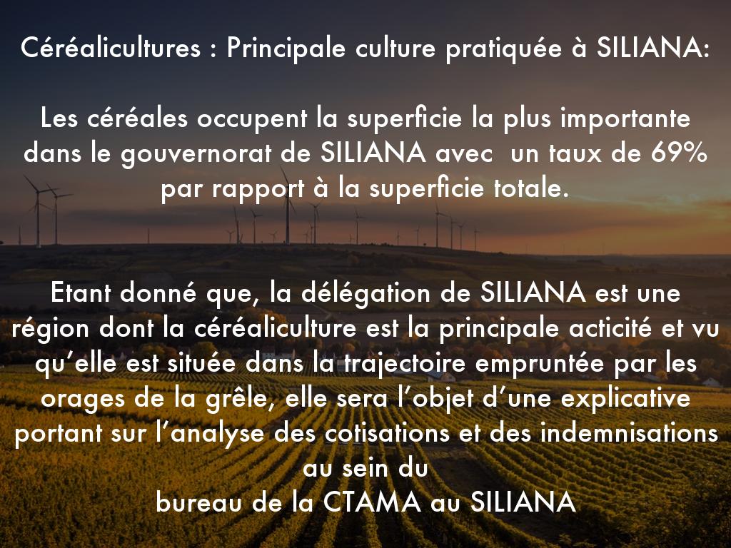 Etant donné que, la délégation de SILIANA est une région dont la céréaliculture est la principale acticité et vu qu’elle est située dans la trajectoire empruntée par les orages de la grêle, elle sera l’objet d’une explicative portant sur l’analyse des cotisations et des indemnisations au sein du
