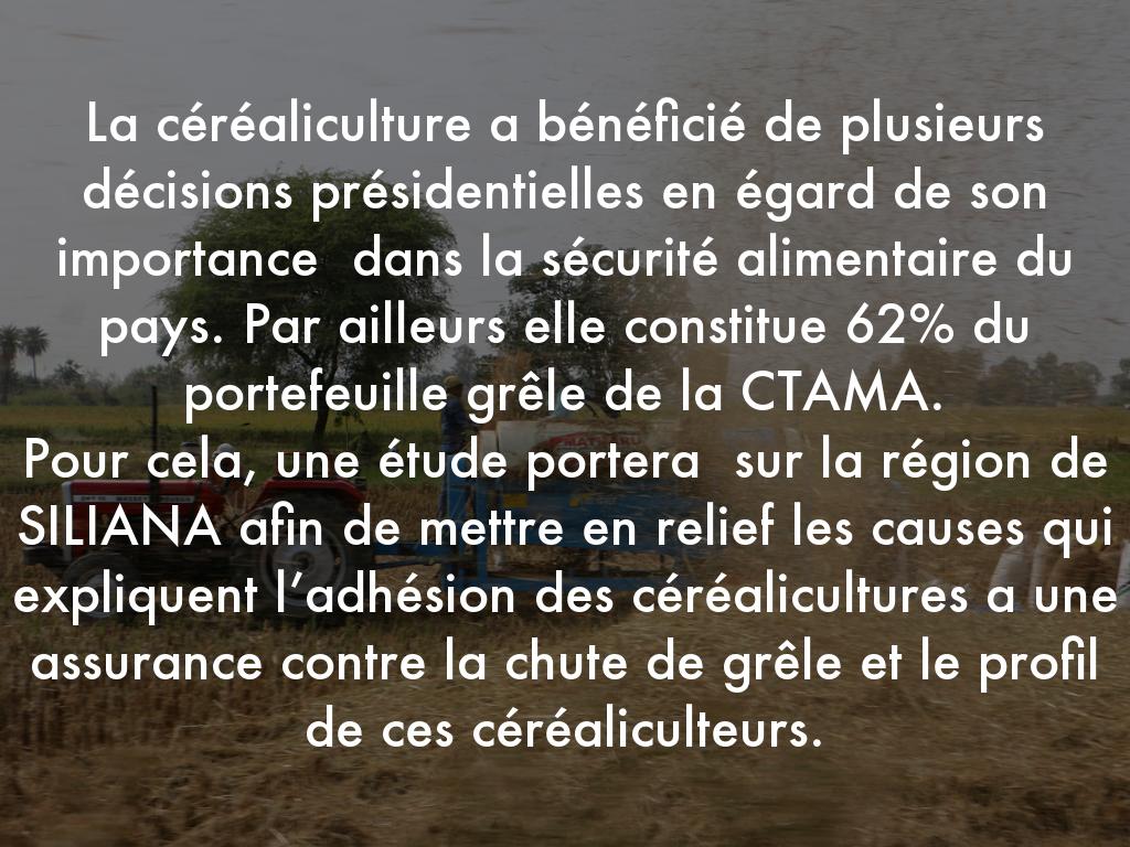 La céréaliculture a bénéficié de plusieurs décisions présidentielles en égard de son importance dans la sécurité alimentaire du pays. Par ailleurs elle constitue 62% du portefeuille grêle de la CTAMA.