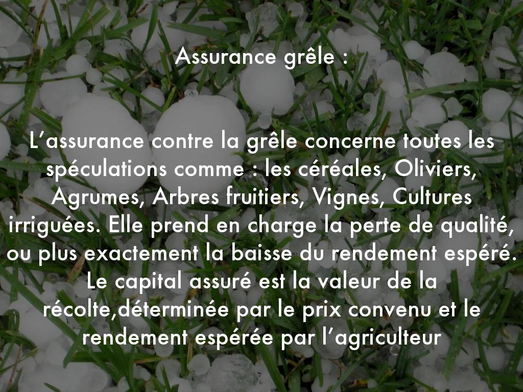 Agrumes, Arbres fruitiers, Vignes, Cultures irriguées. Elle prend en charge la perte de qualité, ou plus exactement la baisse du rendement espéré. Le capital assuré est la valeur de la récolte,déterminée par le prix convenu et le rendement espérée par l’agriculteur