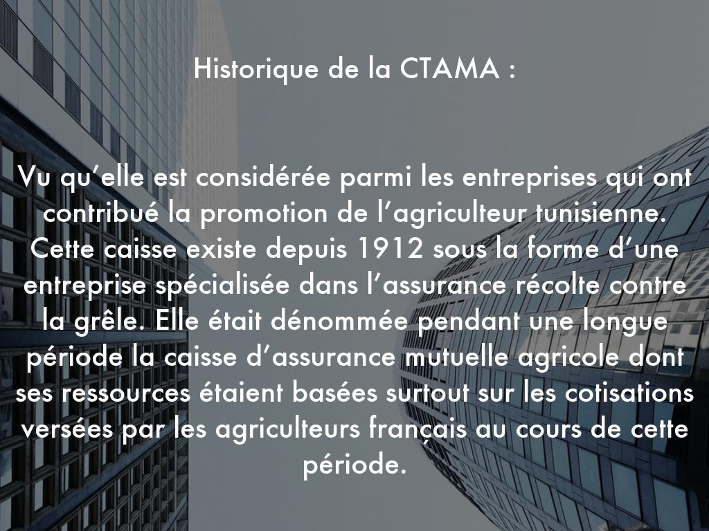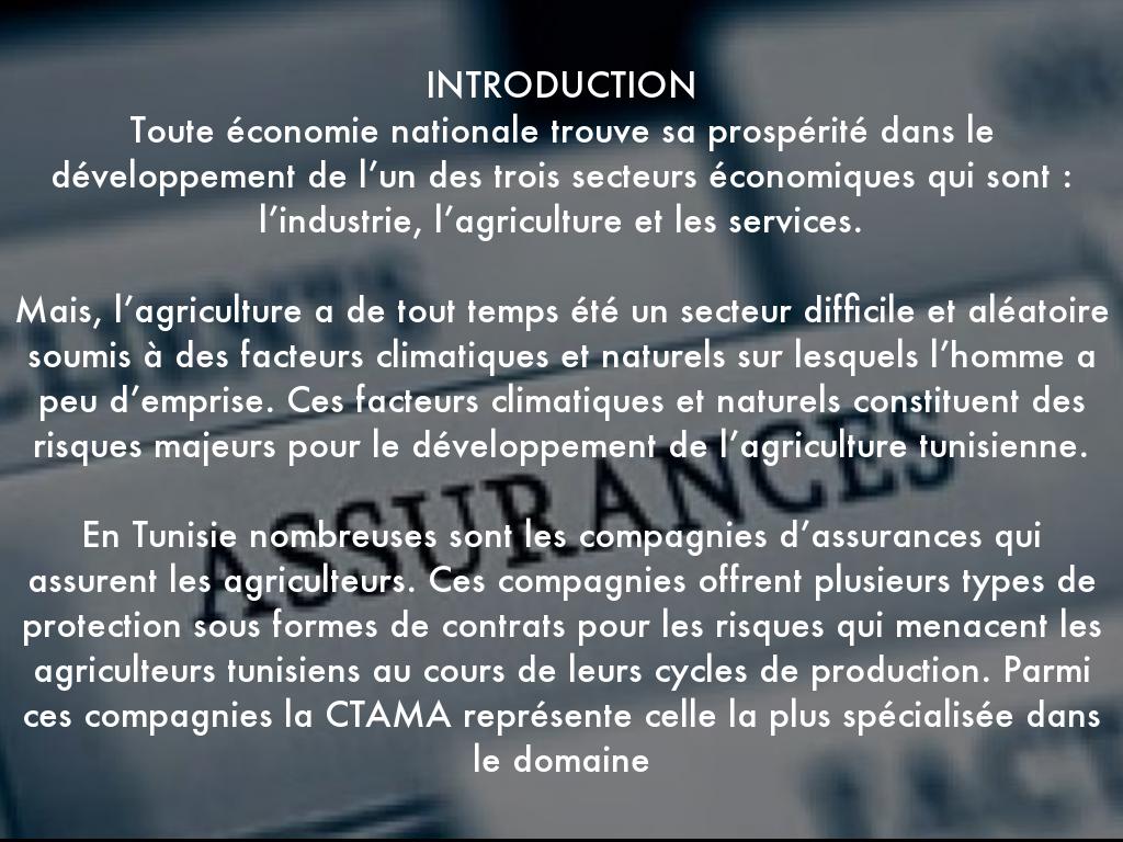 En Tunisie nombreuses sont les compagnies d’assurances qui assurent les agriculteurs. Ces compagnies offrent plusieurs types de protection sous formes de contrats pour les risques qui menacent les agriculteurs tunisiens au cours de leurs cycles de production. Parmi ces compagnies la CTAMA représente celle la plus spécialisée dans le domaine