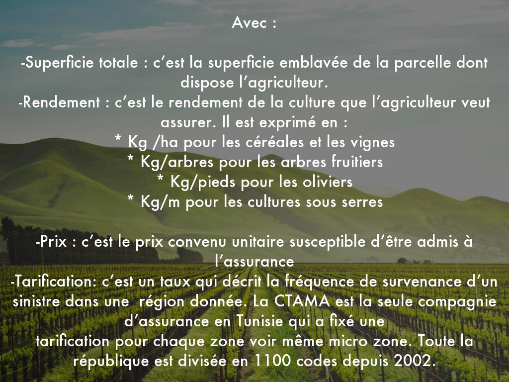 -Tarification: c’est un taux qui décrit la fréquence de survenance d’un sinistre dans une région donnée. La CTAMA est la seule compagnie d’assurance en Tunisie qui a fixé une
