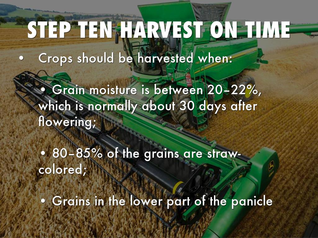 • Grain moisture is between 20–22%, which is normally about 30 days after flowering;