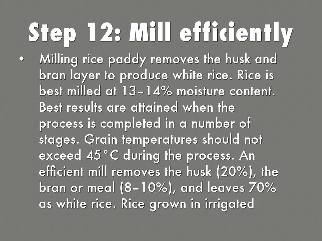 Milling rice paddy removes the husk and bran layer to produce white rice. Rice is best milled at 13–14% moisture content. Best results are attained when the process is completed in a number of stages. Grain temperatures should not exceed 45°C during the process. An efficient mill removes the husk (20%), the bran or meal (8–10%), and leaves 70% as white rice. Rice grown in irrigated systems should attain 60% white rice as head rice (unbroken, white kernels) and rain fed systems 40–50% as head rice.