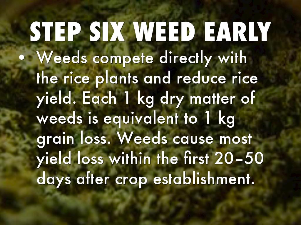 Weeds compete directly with the rice plants and reduce rice yield. Each 1 kg dry matter of weeds is equivalent to 1 kg grain loss. Weeds cause most yield loss within the first 20–50 days after crop establishment.