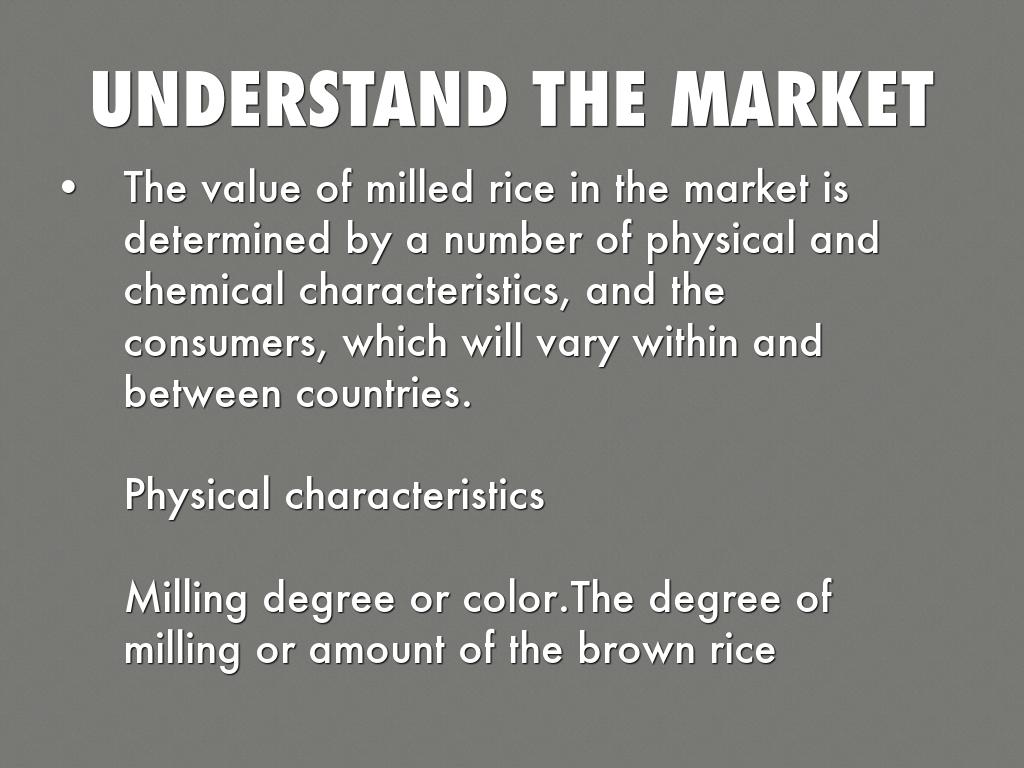 The value of milled rice in the market is determined by a number of physical and chemical characteristics, and the consumers, which will vary within and between countries.