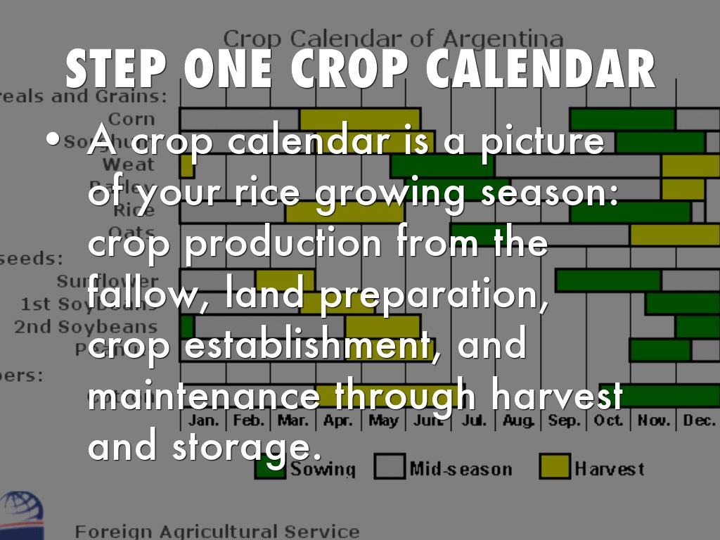 A crop calendar is a picture of your rice growing season: crop production from the fallow, land preparation, crop establishment, and maintenance through harvest and storage.