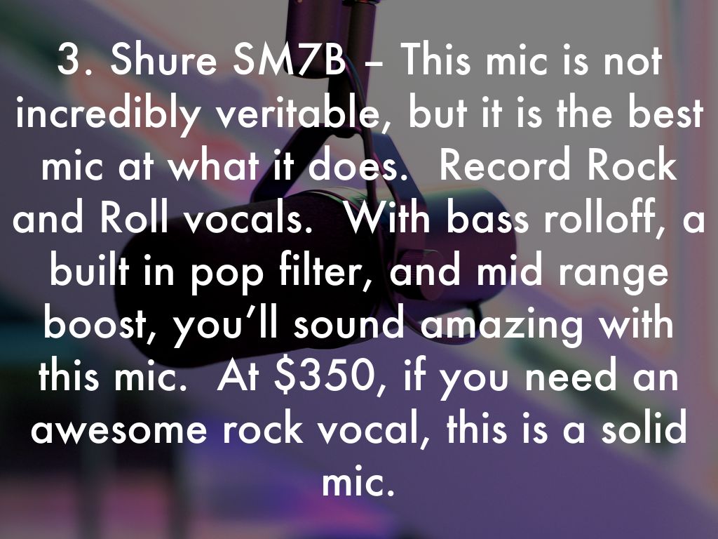 3. Shure SM7B – This mic is not incredibly veritable, but it is the best mic at what it does. Record Rock and Roll vocals. With bass rolloff, a built in pop filter, and mid range boost, you’ll sound amazing with this mic. At $350, if you need an awesome rock vocal, this is a solid mic.