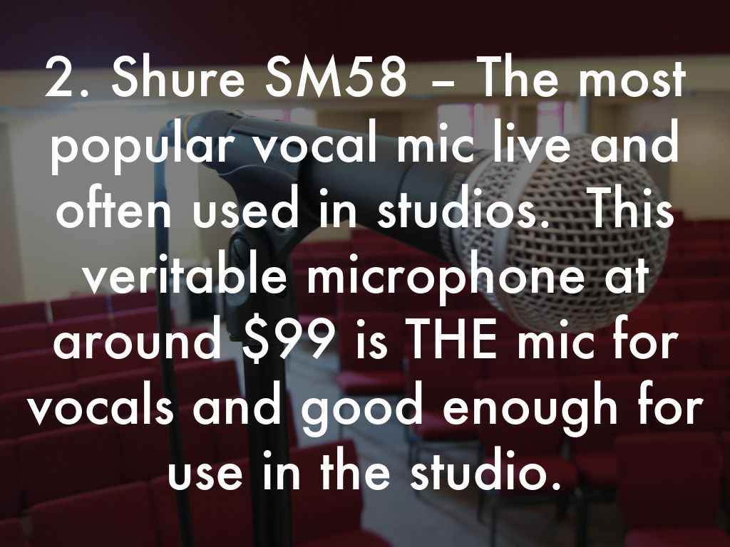 2. Shure SM58 – The most popular vocal mic live and often used in studios. This veritable microphone at around $99 is THE mic for vocals and good enough for use in the studio.