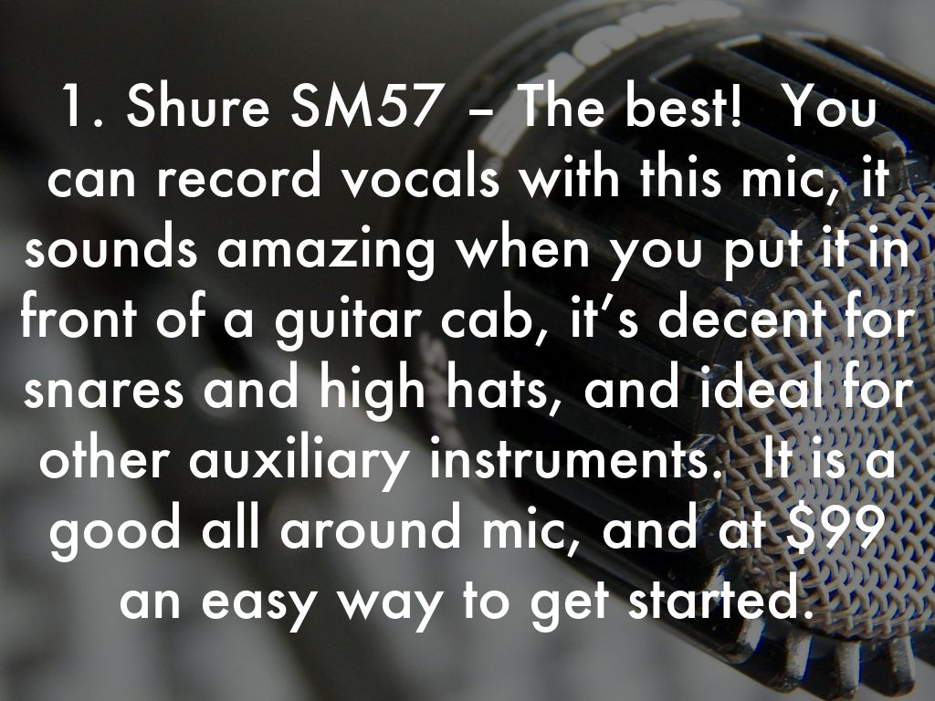 1. Shure SM57 – The best! You can record vocals with this mic, it sounds amazing when you put it in front of a guitar cab, it’s decent for snares and high hats, and ideal for other auxiliary instruments. It is a good all around mic, and at $99 an easy way to get started.