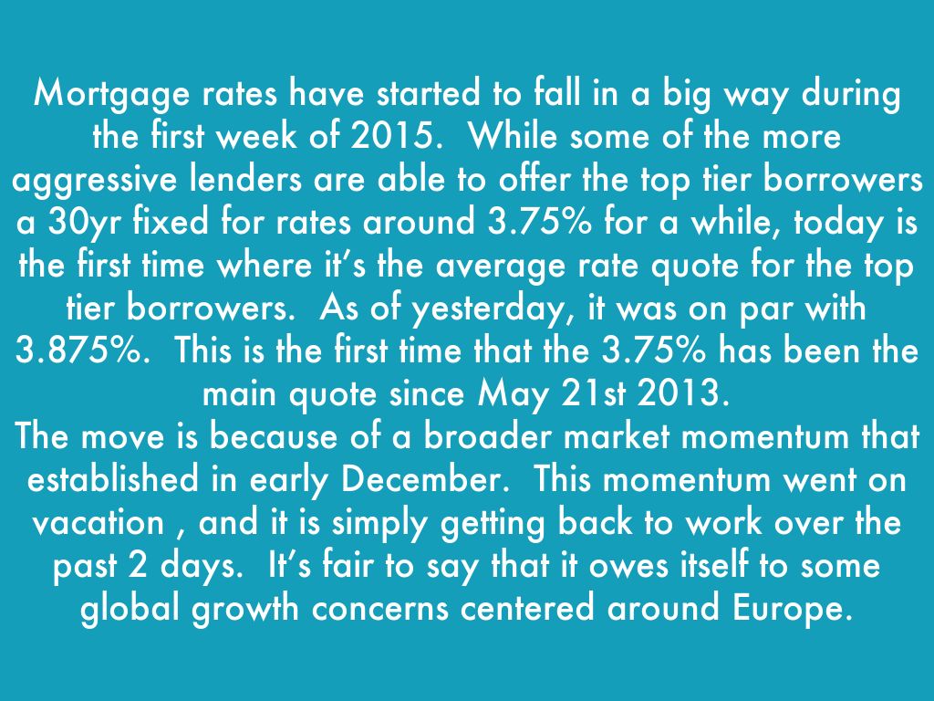Mortgage rates have started to fall in a big way during the first week of 2015. While some of the more aggressive lenders are able to offer the top tier borrowers a 30yr fixed for rates around 3.75% for a while, today is the first time where it’s the average rate quote for the top tier borrowers. As of yesterday, it was on par with 3.875%. This is the first time that the 3.75% has been the main quote since May 21st 2013.