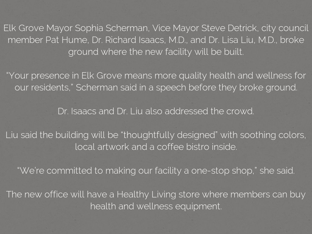 “Your presence in Elk Grove means more quality health and wellness for our residents,” Scherman said in a speech before they broke ground.